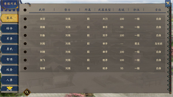 - 武将界面:查看武将的属性、装备、技能和忠诚度等信息。
