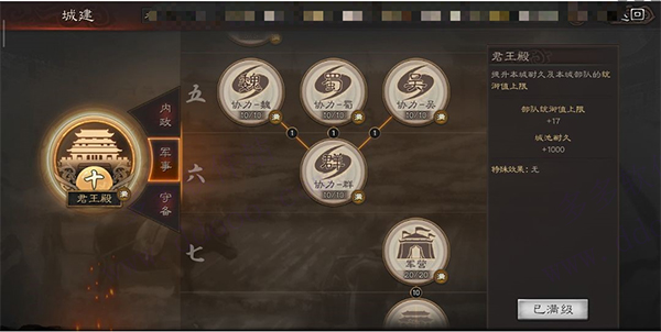 2、协力-群,需要上阵3名同位群阵营的武将才能激活,升到10级可以获得10%的群阵营属性加成,以及提升群阵营武将在战斗中获得10%的经验加成。