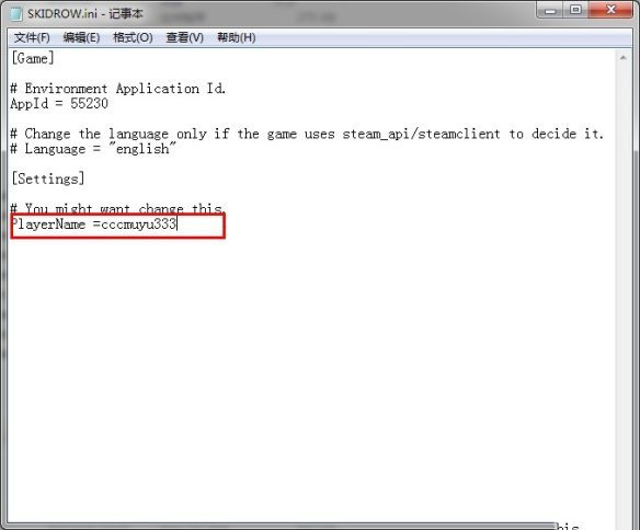 2、记事本打开游戏目录的SKIDROW.ini,PlayerName = ALI213改成自己想要的英文名字。