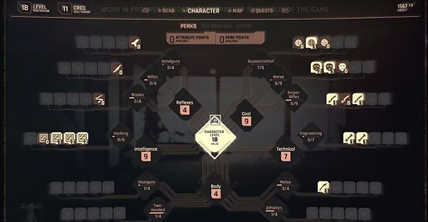 - 技能树:分为近战、枪械、网络和生存类别,每个技能有5个等级的提升。