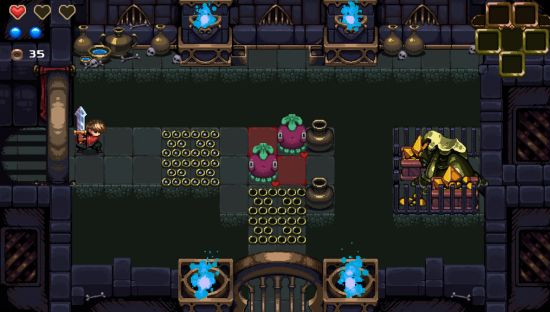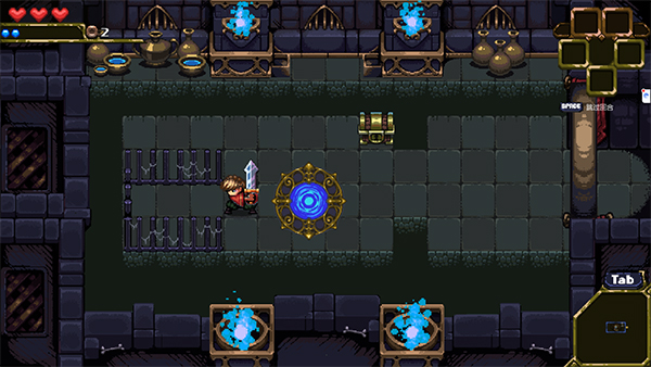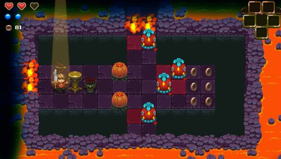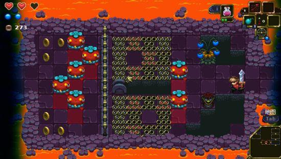 虽然你是勇者,但是你的装备库很简单,魔法剑、精弓、良盾。以及可以放置的炸弹、可以不受坠落伤害的药水。你也没有什么花哨的技能树或复杂的连招,战斗更侧重于对敌人攻击模式的观察、时机的把握和地形的利用。比如说那个爆炸南瓜,你需要精确计算引爆距离,避免自己被炸到;对付大范围喷毒的酸性史莱姆,则要小心避开它的杀伤范围。多数小怪都可以直接一击毙命,你只需要把握好时机就行了,或者有些难缠的怪,直接用弓箭远程击杀就好了,但是要注意箭矢是很宝贵的喔,两根用完就只能等在特定关卡中刷新了。