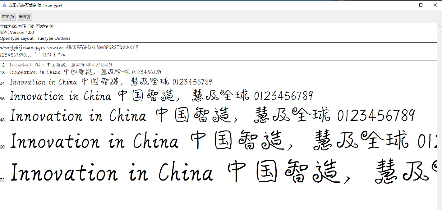 方正手迹可爱多简是方正字库推出的一款实用的中文字体,该字体采用了大量的类似棒棒糖的元素,用以代替或无缝衔接上一些部件,配上颇具特色的字形,饶有趣味,可以应用于文本装潢、信息展示、网页设计、篆刻制模、数据制作、装潢设计、计算艺术设计、视觉设计、字帖等一切合法应用场景,有喜欢的朋友可免费下载收藏。