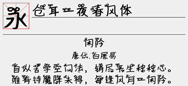 仓耳一夜春风体是一款很可爱的卡通儿童字体,圆润的外形加上小草点缀,看起来特别清新有趣。这款字体结构清晰,容易识别,适合各种应用场景,比如网页设计、装潢设计甚至篆刻制模。安装方法也很简单,下载后解压,双击就能用。