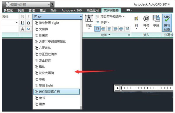5、按照以上方法安装完成之后,打开CAD软件,当需要输入文字的时候,在字体选项框中,可以找到安装后的相应字体即可;