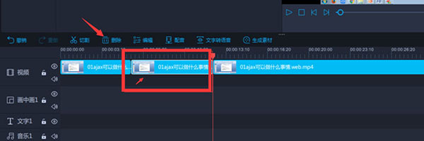 5、选中刚才切割的视频,注意选中时视频边框是白色,点击上面删除按钮即可;