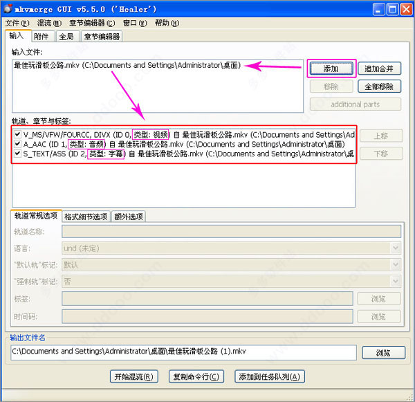 打开mkvtoolnix工具把视频与字幕文件同时导入软件。