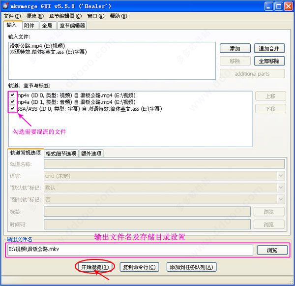 要把字幕添加到视频里面所以在混流前需要把视频音频字幕都勾选上然后设置输出文件名即存储目录即可开始混流。
