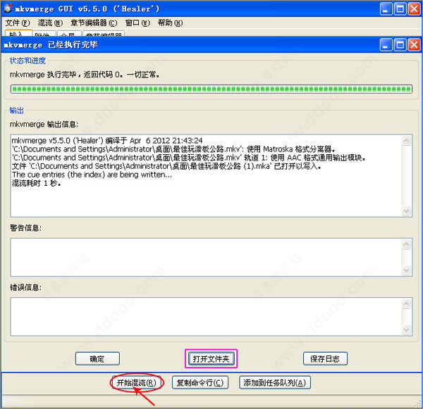 选择需要提取的文件及设置文件名及存储路径之后点击软件最下方的“开始混流”按钮软件即开始提取文件执行完毕之后可直接通过“打开文件夹”找到提取之后的文件。