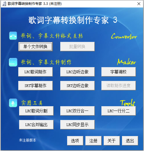 除此之外,歌词字幕转换制作专家还拥有双行合一、歌词字幕制作、歌词分割、歌词同步显示等诸多功能,极大的提高处理歌词字幕的效率。歌词字幕转换制作专家为绿色软件,无需安装就能直接打开使用,即使是非注册用户也可以使用大部分的功能,赶紧来下载使用吧。