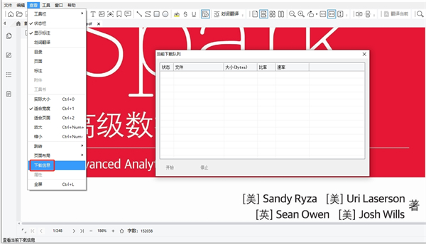 3、点击查看-下载信息,将会出现下载信息的控制窗口,如下图示,后缀名为 CAA 的文件里面保存的实际上是 www.cnki.net 中国学术期刊网上的特定图书的 HTTP 链接,打开 CAA 文件后将立即下载该图书,为了控制下载进程,特提供上述控制窗口,窗口的中间列表里列出了正在下载的图书的状态,文件名,文件大小,已经下载完成的比率和下载速率;