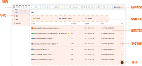 1、进入软件首页,里面汇聚了最近阅读、翻译、收藏和我的电脑,可通过导航切换查看。文档支持打印、另存为、发邮件、收藏、取消收藏、定位、移除的操作,移除不会删除本地的文件。