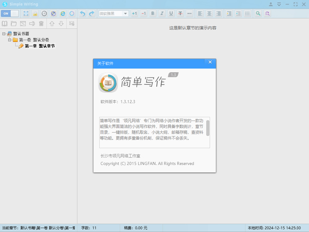 简单写作是一款功能强大又操作简单的电脑写作软件,和小黑屋类似但更简单,支持实时保存、计时保存和邮箱存稿,还有时光机器备份,完全不用担心丢稿。界面设计也很清爽,用了全新的UI,灰白配色看起来特别舒服。它还有很多实用功能,比如小说大纲、随机取名、资料库这些都能让写作变得更高效。最棒的是完全免费,不用注册也不用花钱,这点真的很贴心。