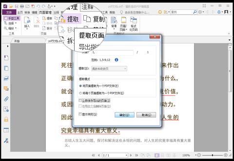 3、点击“提取”按钮,拆分分割指定页并导出另存为其他PDF文档;
