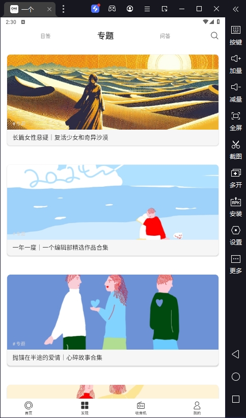 这个软件叫“ONE·一个”,是个挺有意思的阅读软件,它像一个温馨的朋友圈,在电脑上运行。每天花30分钟看看书、听听音乐、看看电影,生活就变得很充实了。软件里有精选的插画和文章,还有各种电台、问答和互动功能,比如写日记、关注作者啥的。我挺喜欢这种设计,因为它不仅让你看书,还能发现很多新鲜玩意儿,感觉生活变得更有趣了。如果你喜欢阅读或者想换个方式放松,这个软件值得一试。