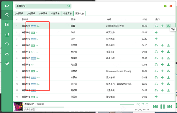 5、此时,搜索结果都展示出来了,我们点击自己想要下载的歌曲中的下载按钮,洛雪音乐助手便开始下载歌曲。