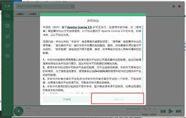 2、双击“lx-music-desktop.exe”即可直接运行,无需安装,首先耐心阅读协议,接着点击“我接受”