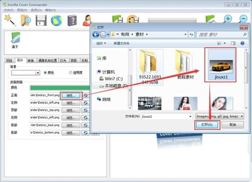 4、在设计界面中,我们可以修改背景颜色、封面颜色,盒子每一个面的图片。极速小编以盒子正面为例子。点击盒子正面图片地址栏右边的浏览,在文件选择窗口中选择想要使用作为盒子正面的图片文件,点击打开;
