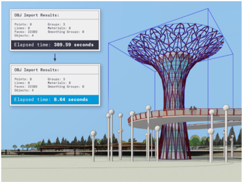 使用上图中现有的 .obj 导入器代码,拥有 22,000 个面的塔在 389 秒内导入,大约需要 6 分半钟。使用新的 Entities Builder API 界面,同一塔可在 9 秒内导入。哇,好快啊