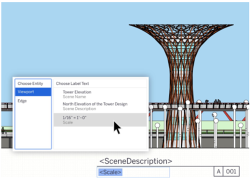 借助新的和改进的基于视口的自动文本标签,您可以在编写文档时使用嵌入在 SketchUp 模型中的更多信息,从而使您的模板更加强大和高效。例如,您可以使用自动文本标签选择场景名称或描述,以自动填充绘图标题。然后使用标签来显示当前视口的比例。如果模型视口的比例发生变化,比例标注将自动更新。