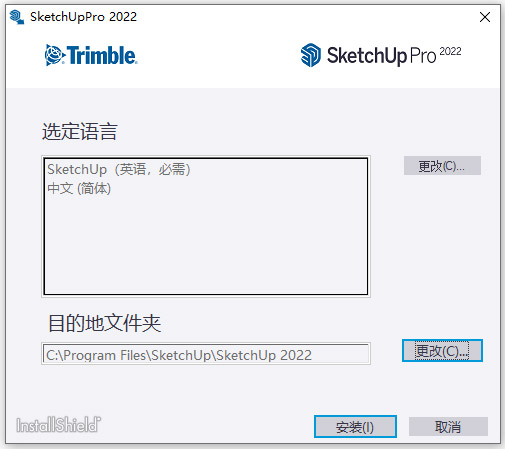 2、双击文件“SketchUpPro2022 v22.0.354 x64.exe”开始安装软件,选择中文语言,设置安装目录,注意不要用中文路径;