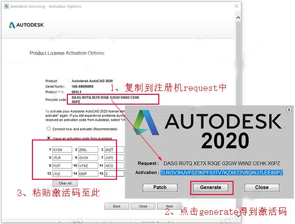 17、这里将request code值复制到注册机request中,再点击generate得到激活码,再将激活码复制到软件注册框中,点击next即可激活;