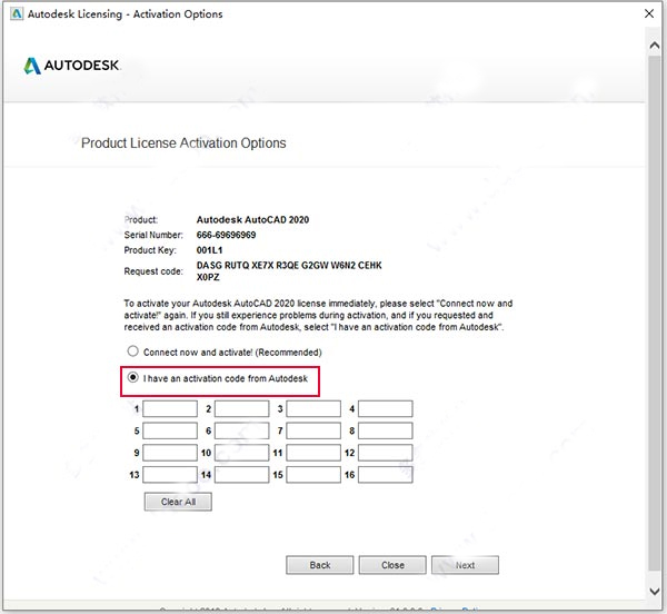 16、返回注册界面,重新打开cad2020软件,继续12步、13步操作,重新进入注册界面,选择“i have an activation cdoe...”显示如下: