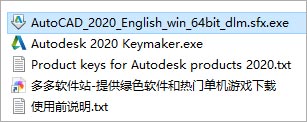 1、下载解压,得到autodesk autocad 2020 64位原程序、autocad2020注册机64位以及序列号和密钥;