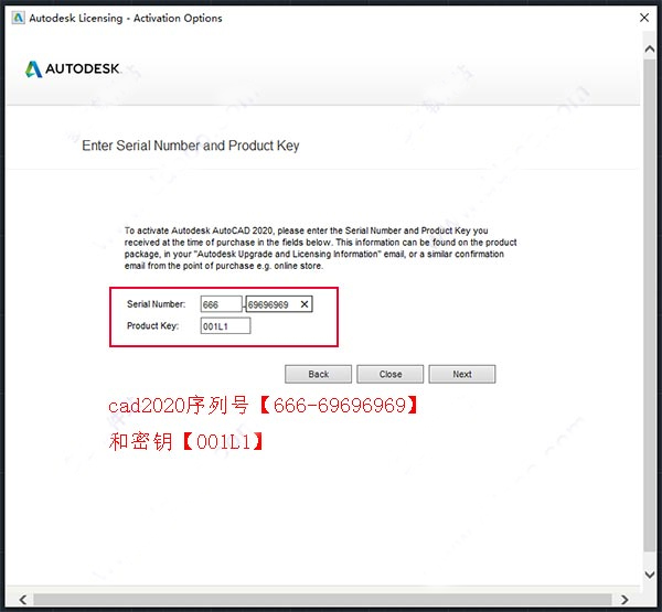 12、输入cad2020序列号【666-69696969】和密钥【001L1】,点击next继续;