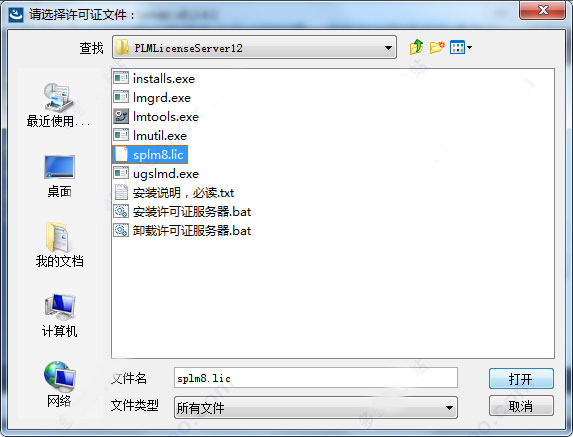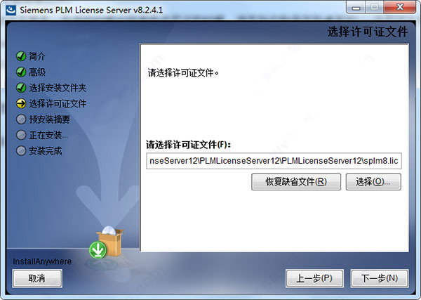 4、安装目录保持默认,许可文件这里,我们选择刚修改的“splm8.lic”载入,然后完成安装