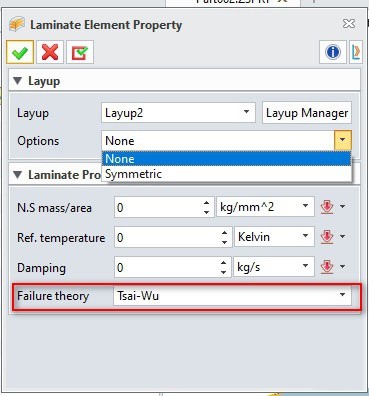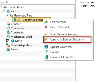 3、完成铺层定义后,右键仿真树中的几何体,在层合板属性中选择新建的铺层,并按实际情况设置其他属性参数,如可选择对称层合板,或者失效系数。