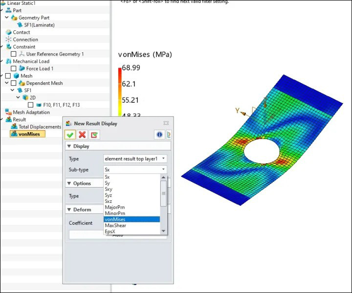 7、完成以上所有步骤后,即可运行计算。ZWSim中的复合材料采用经典层合板理论,即各层之间不会发生相对移动,因此各个铺层的位移结果相同,但应变和应力等结果则不同。同时,软件对每一层也输出其顶部和底部的应力值,故在查看Mises应力值的时候,需要第几层(layer)的顶部或者底部结果。