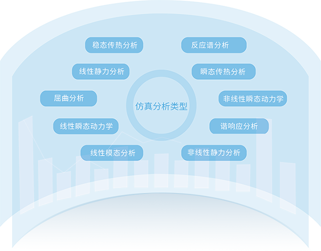 支持线性静力学分析、屈曲分析、模态分析、动力学分析、非线性分析、传热分析等分析类型,满足结构的强度、刚度、稳定性、振动及热传导等多种应用场景的分析需求。
