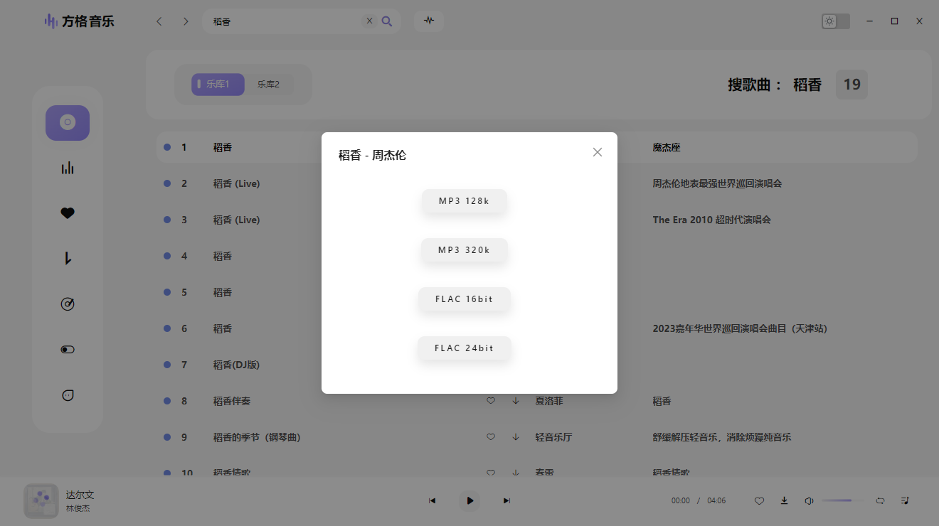 3、如图,可看到包括mp3 128k、mp3 320k、FLAC 16bit和FLAC 24bit四种音乐格式,根据需求点击就可以了,