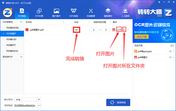 7、可以直接从操作栏下的“打开”按钮,打开转换完成的图片文件;或点击文件夹图标,查看文件所在的文件夹位置;