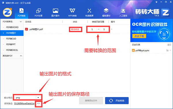 5、在后方的方框中可以输入需要转换成图片文件的pdf文件页码,并在左下方可选择输出的文件格式以及文件保存路径;