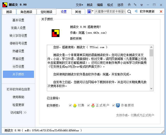 ps:这里小编给大家带来的是朗读女破解版,此版本内附破解补丁,可完美破解程序,让你可以无时间限制的免费使用该软件,小编亲测真实有效,有需求的用户请自行下载使用,具体安装破解教程可参考下文。