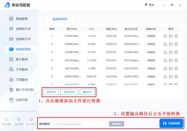 2、上传文件后,我们可以在界面下方设置输出路径参数,设置完参数后我们只需点击【开始转换】按钮,软件就会自动将视频转换成音频。