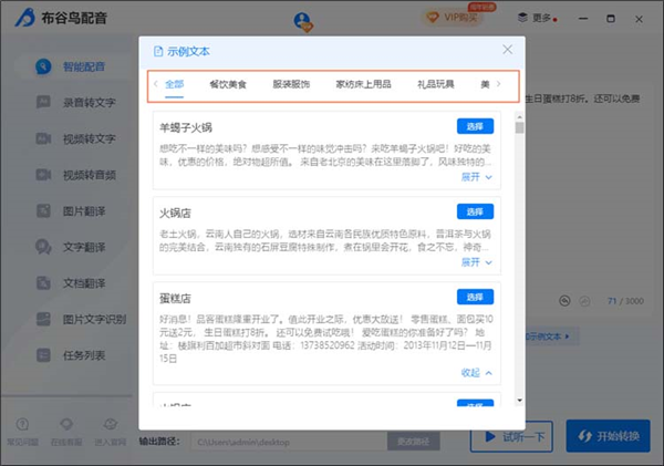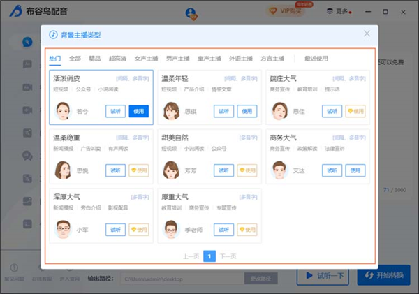2、真人情感配音 : 百位主播真人发音,支持普通话、方言以及多种外语配音