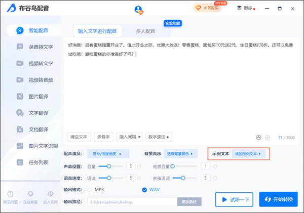 同时布谷鸟配音软件的文本识别功能非常的强大,会根据文本的故事性自由的分配阅读段落,也会根据标点符号来设置间隔断句,还会根据不同语音类型的角色来呈现配音段落,达到朗读流畅自然、声情并茂的拟人化效果,给用户带来沉浸式的配音体验。此外,布谷鸟配音软件电脑版拥有语音转文字、视频转文字、视频转音频、图片文字识别、文档翻译等等功能,有需要的用户赶紧来本站下载体验吧。