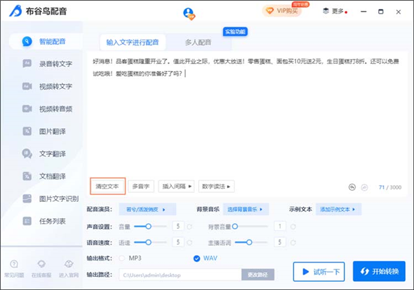 ⑩最后可以点击“试听一下”感受一下音频的效果,确认没问题的话就可以点击“开始转换”进行单人配音了。