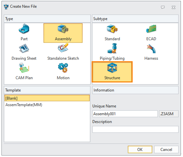 提供单独的结构件文件类型。在创建文件时,可选择装配 >> 结构件完成文件的创建。文件创建完成后,软件将直接进入到结构件设计模块,可开始下一步的结构件模型设计。