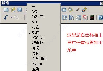 3、工具栏:如果要显示当前隐藏的工具栏,可在任意工具栏上右击,此时将弹出一个快捷菜单,可从中通过选择命令来显示或关闭相应的工具栏。