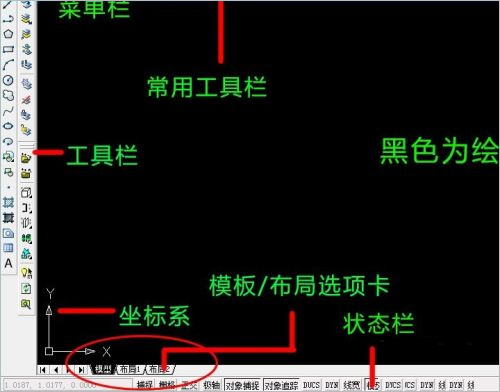 4、绘图窗口:绘图窗口的下方有“模型”和“布局”选项卡,单击其标签可以在模型空间或图纸空间之间来回切换。