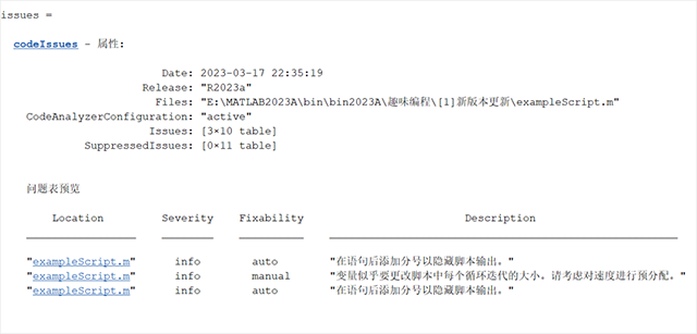 issues=codeIssues("exampleScript")