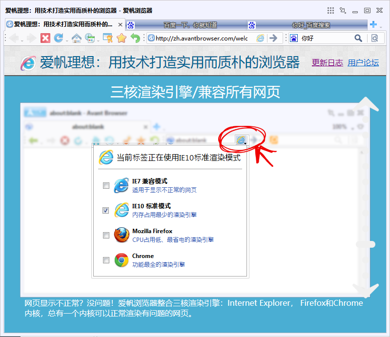 网页显示不正常?没问题!爱帆浏览器整合三核渲染引擎:Internet Explorer, Firefox和Chrome内核,总有一个内核可以正常渲染有问题的网页。