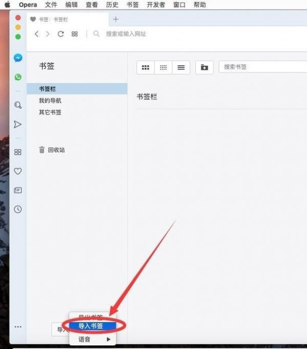 4、打开Opera浏览器后,点击屏幕顶部工具栏上的“书签”;