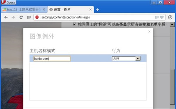 9、这里我们填上百度的网址(前面不用http),然后在后面选择“允许”