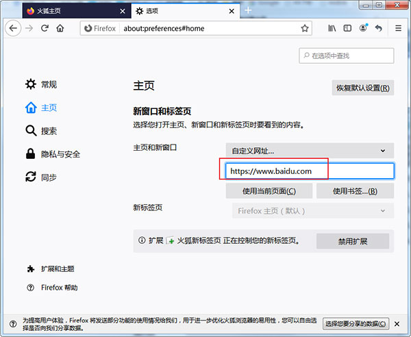 4、我们将主页地址改成自己设置成主页的网址就可以了,修改完后重新打开火狐浏览器就会发现主页已经成功更改了。
