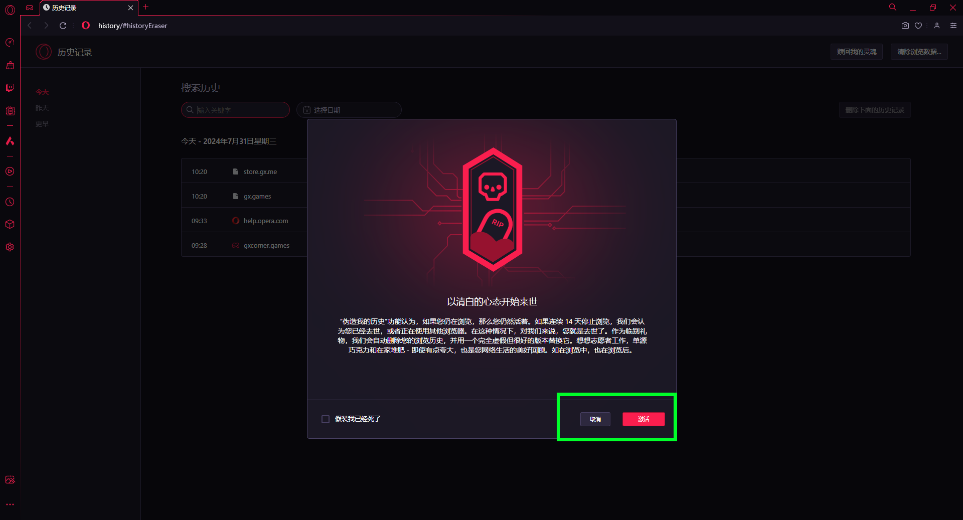 4、你也可以勾选“假装我已经死了”,确定后会直接生成覆盖你的历史记录,开启你的崭新人生。
