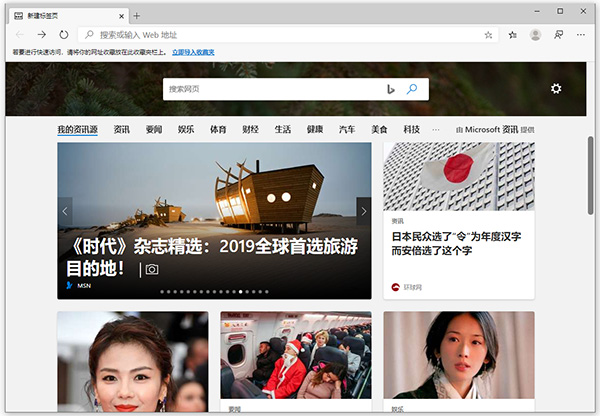 3、默认主页,采用的是bing的搜索引擎,同时会显示最近访问的网站列表;